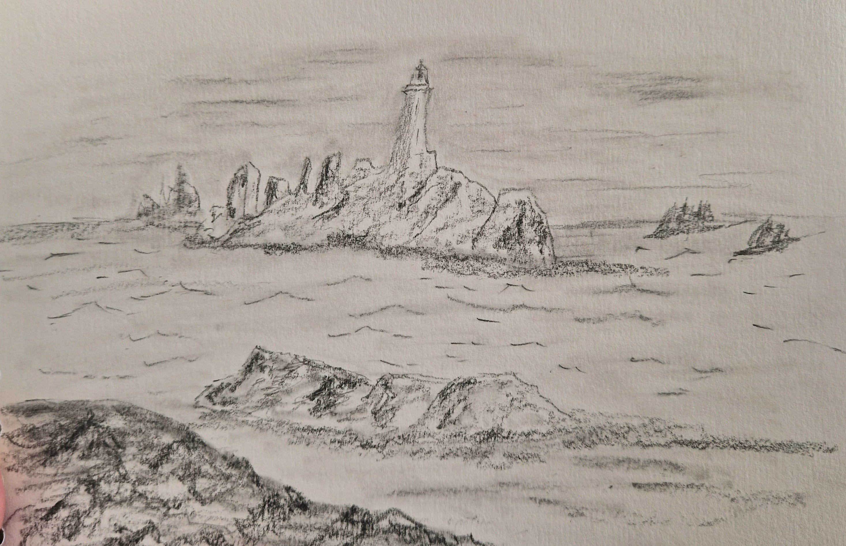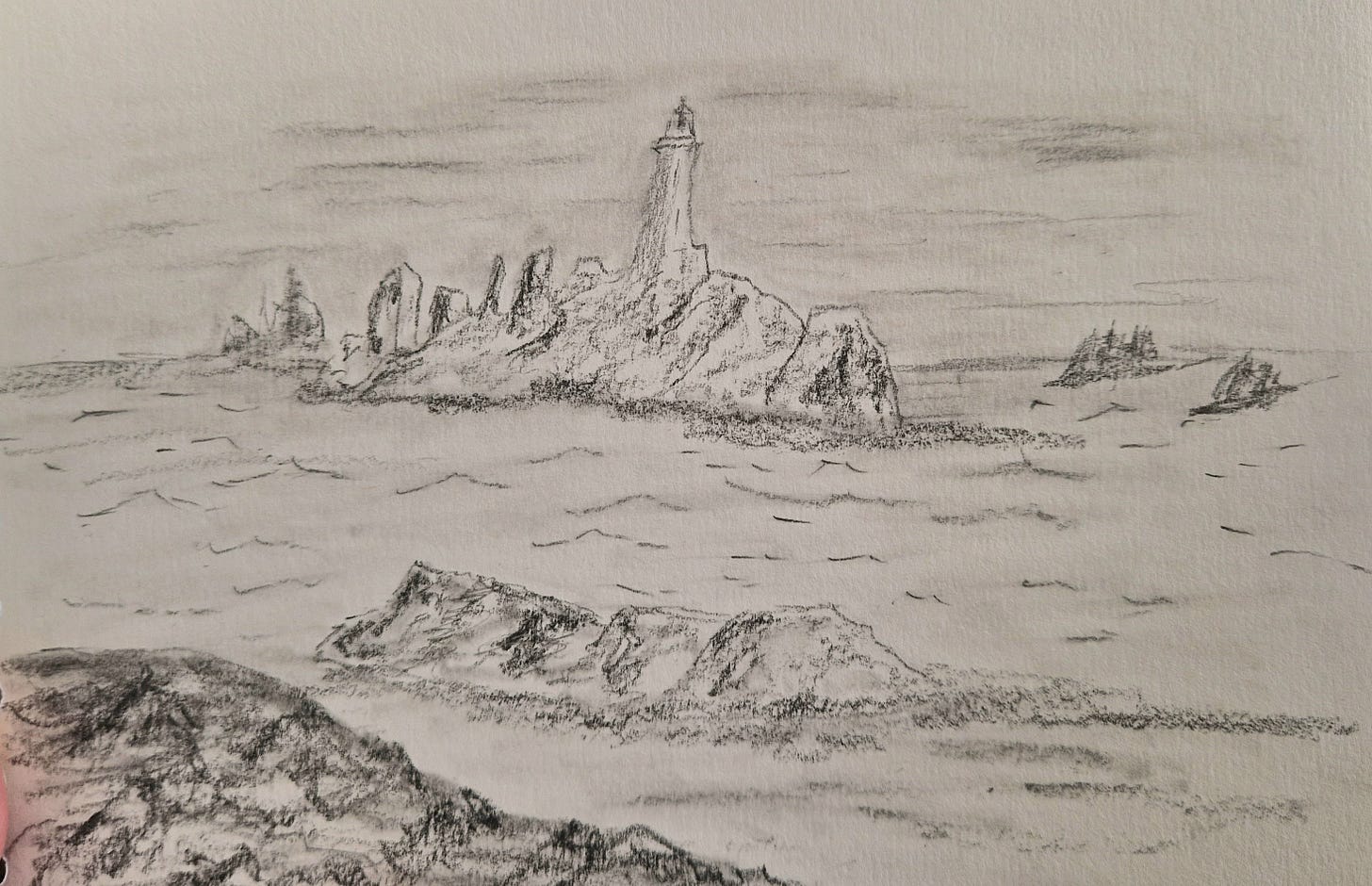 Even while away, I still had my pencils and sketch book with me and created the image below in just a few minutes. Strangely, we hadn’t visited or seen any lighthouses when I created this and yet it is almost identical to La Corbiere lighthouse. I think I must have seen an image or a painting somewhere along our travels and it came out in my freehand sketch.